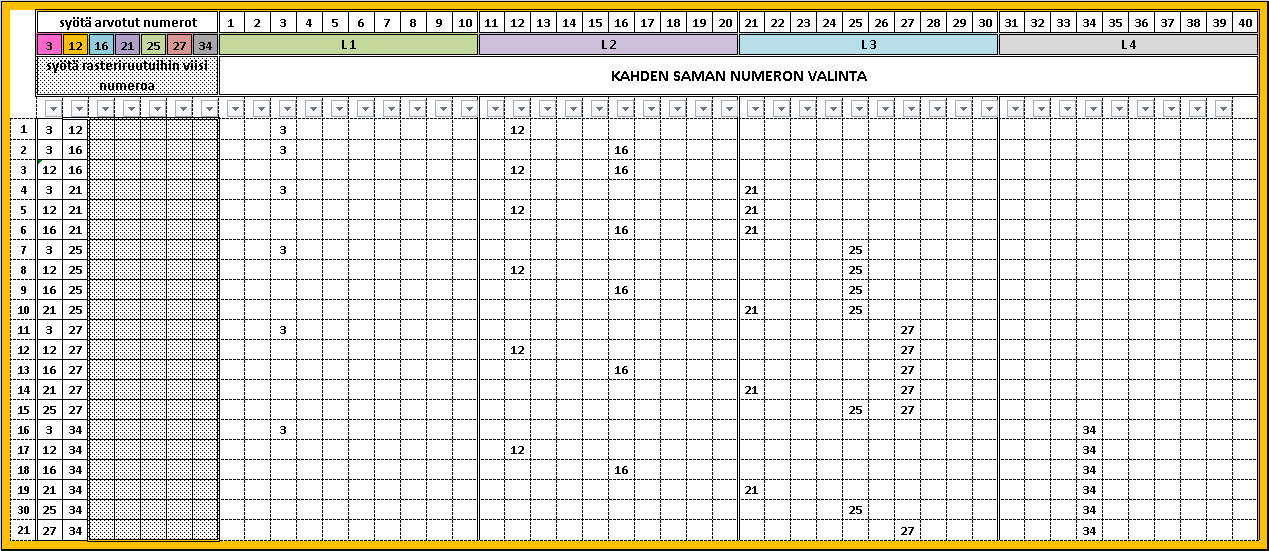 Syötä arvottu rivi kenttään, syötä arvotut numerot. Numero jakaantuvat automaattisesti numerojanalle 1 – 40. Syötä rasteroituihin ruutuihin puuttuvat viisi numeroa. Kuten taulukko kertoo, kaksi samaa numeroa on jokin kahdestakymmenestä vaihtoehdosta.