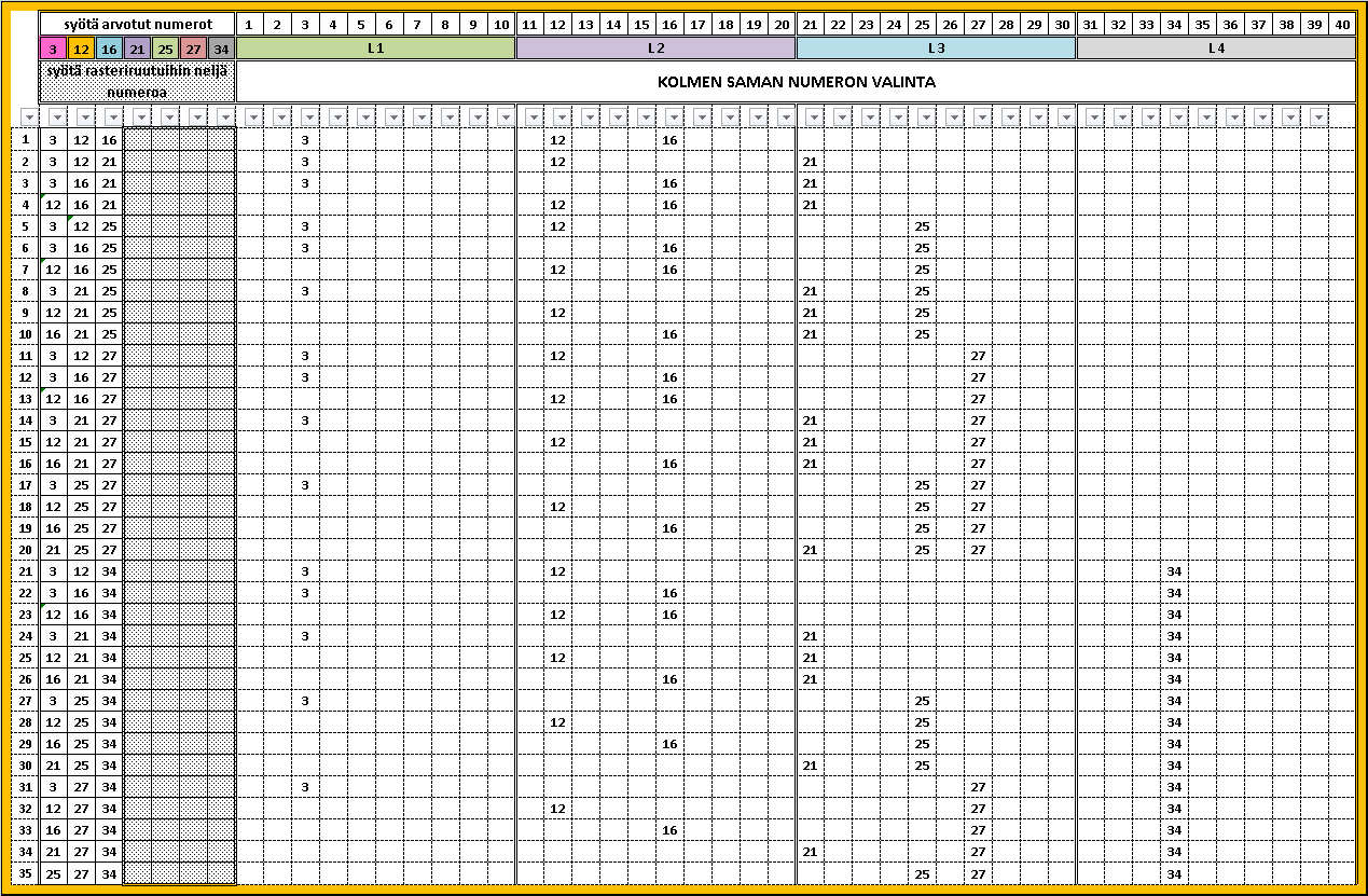 Syötä arvottu rivi kenttään, syötä arvotut numerot. Numero jakaantuvat automaattisesti numerojanalle 1 – 40. Syötä rasteroituihin ruutuihin puuttuvat neljä numeroa. Kuten taulukko kertoo, kolme samaa numeroa on jokin kolmestakymmenestäviidestä vaihtoehdosta.