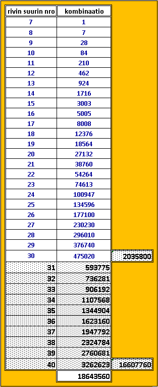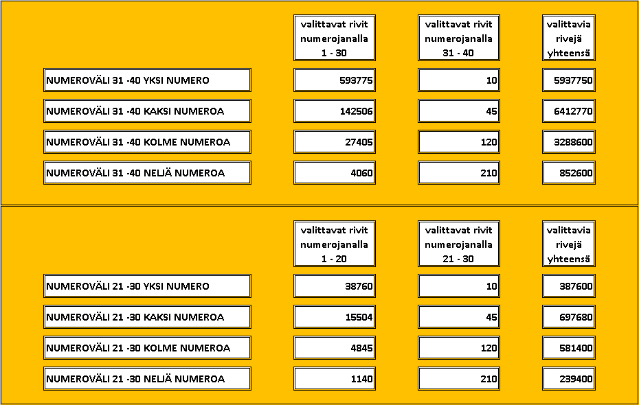 Taulukossa näin on tehty ja sen jälkeen laskettu pelattavien rivien kokonaismäärä. Näin on voitu laskea rivilleen, kuinka monen pelattavan rivimäärän sisällä 7 oikein osumatulos aina on. Tämä tieto on hyödyllinen LOTTOA pelaaville.