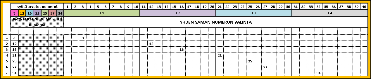 Syötä arvottu rivi kenttään, syötä arvotut numerot. Numero jakaantuvat automaattisesti numerojanalle 1 – 40. Syötä rasteroituihin ruutuihin puuttuvat kuusi numeroa. Kuten taulukko kertoo, yksi sama numero on jokin seitsemästä vaihtoehdosta.