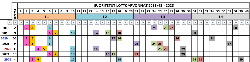 Taulukossa on vuoden 2026 arvotut lottorivit. Taulukko kertoo kaikki nämä viisi perustotuutta suoritetuista LOTTO arvonnoista