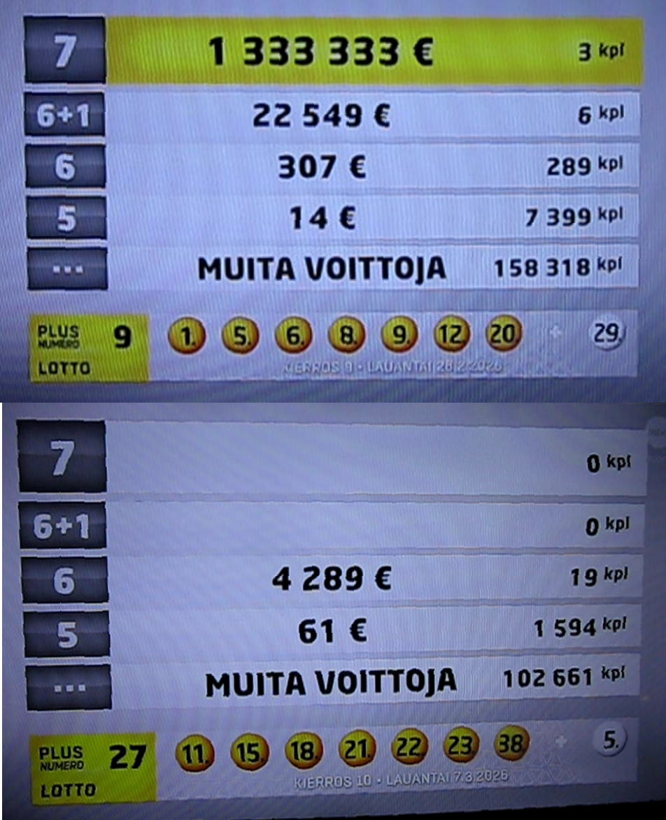 Taulukossa on kahden lottoarvonnan voittajataulukot. Voittajamäärät poikkeavat suuresti toisistaan. Mielenkiintoinen ilmiö. Saattaa olla, että tälle löytyy jokin selityksensä. Taulukossa on yksi ”virhe”. Numeroissa ei ole tietoa siitä, kuinka monta kappaletta on EI VOITTOJA. Sehän olisi erittäin mielenkiintoinen tieto pelaajille – luultavasti.