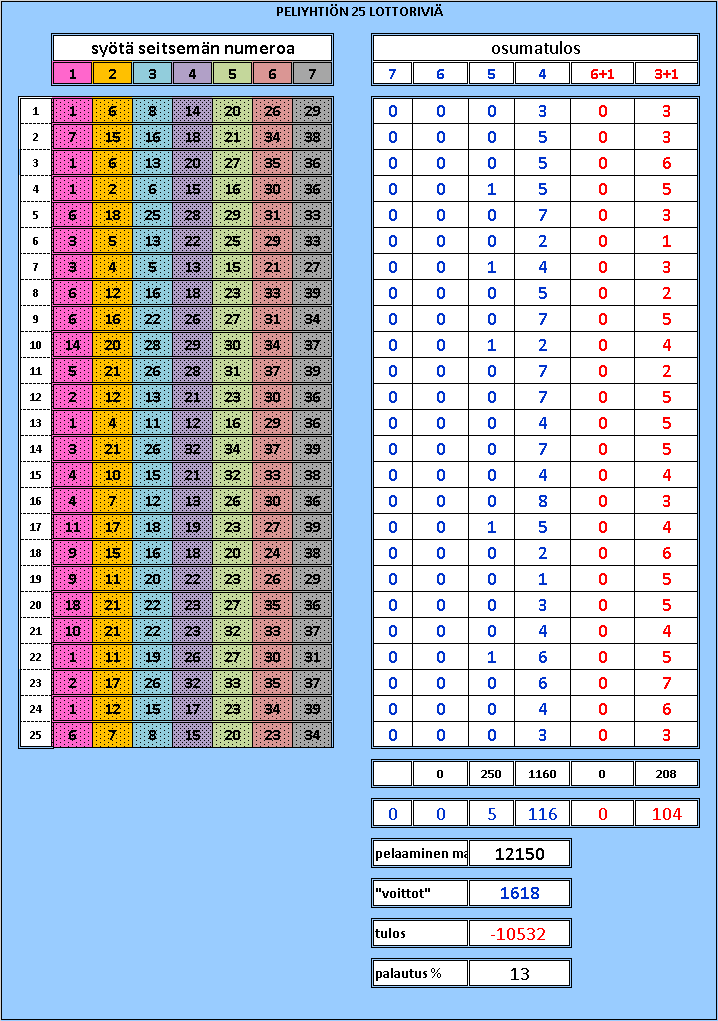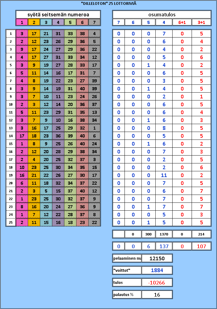 Taulukoissa rivit on lajiteltu eri taulukoihin. Ensimmäisessä taulukossa on arvotut rivit, joissa pelaajat ovat onnistuneet 7 oikein osumatulokseen.