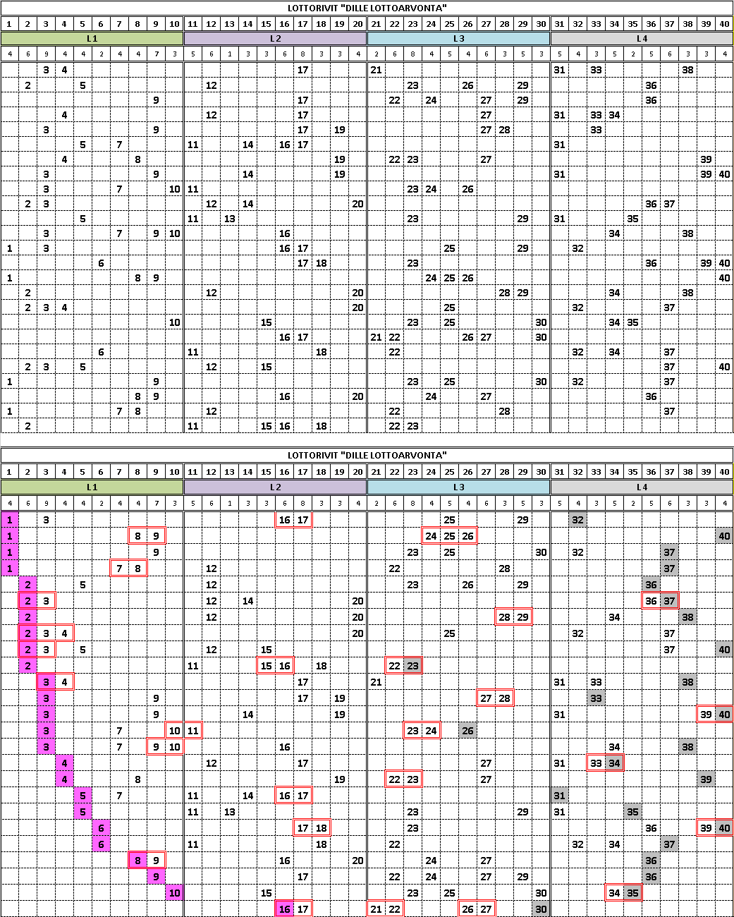 Ainoa vaihtoehto on, että hajautetaan yksittäiset lottorivit numerojanalle 1 – 40 ja tarkastellaan rivejä uudelleen. Taulukot ovat kaksiosaisia siten, että ylemmässä osassa seitsemän numeroa sisältävä rivi on perusmuodossaan ja alemassa osassa rivit ovat lajiteltu pienimmän numeron mukaiseen järjestykseen.