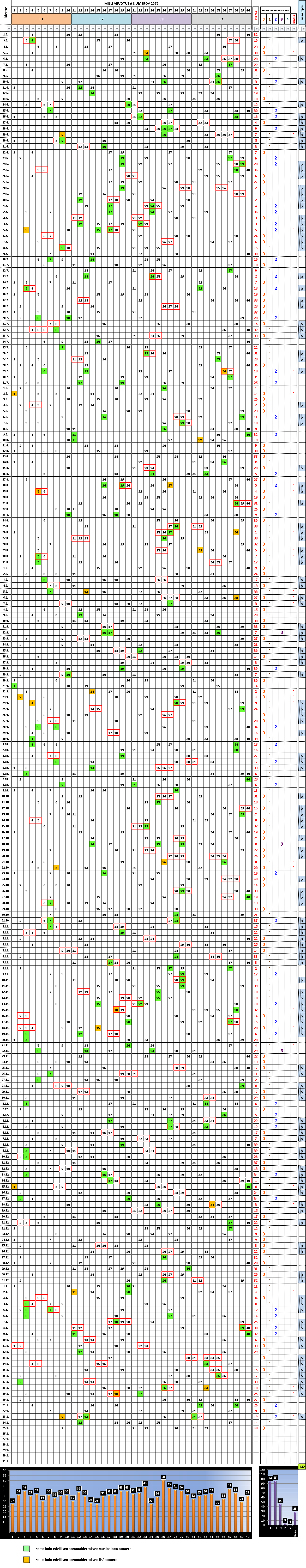 Nämä selviävät taulukoitaessa arvontoja. Taulukossa on vuoden 2025 - 2026 arvotuttuja riviä. Taulukko kertoo kaikki nämä viisi perustotuutta suoritetuista MILLI arvonnoista.