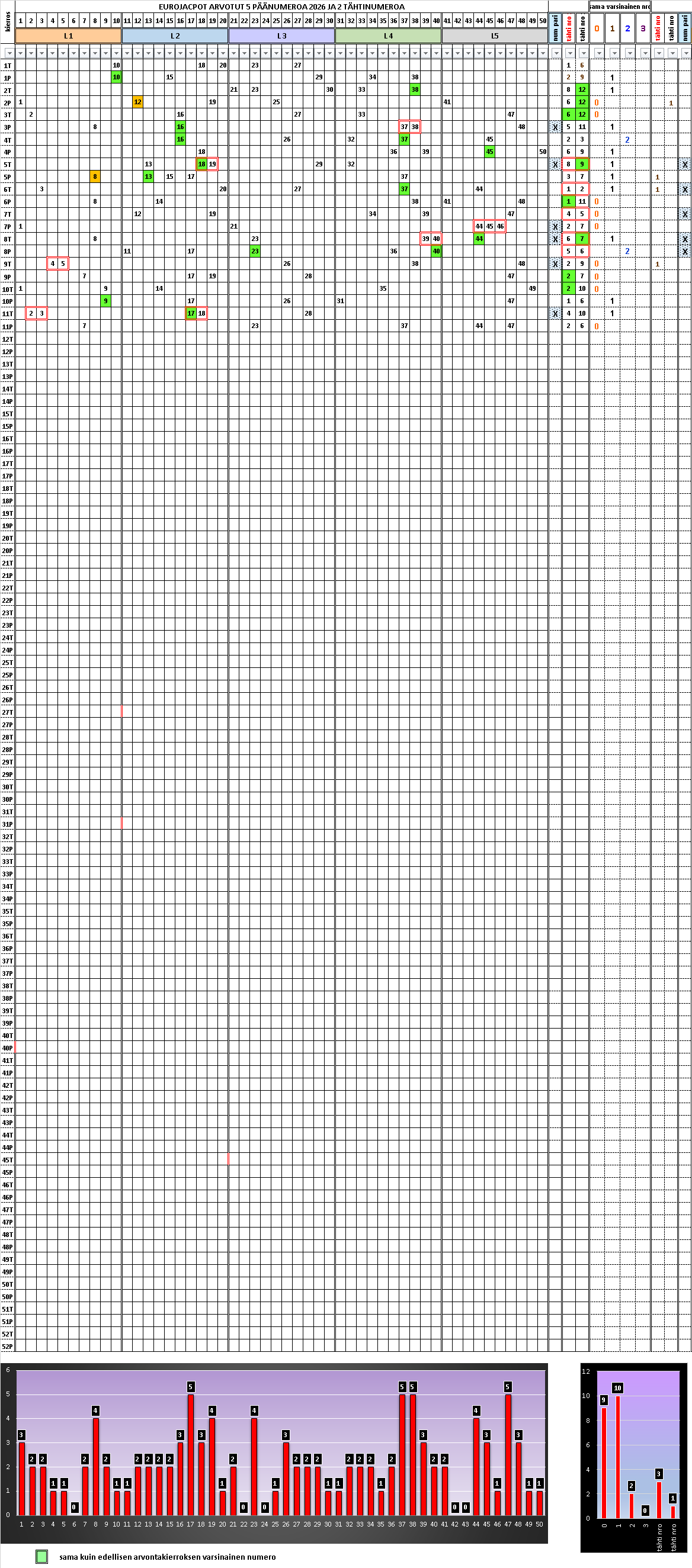 Taulukkoon on lajiteltu arvontatuloksia 2015 eteenpäin. Taulukko on laadittu EXCEL taulukkolaskentaohjelmalla ja siihen on lisätty suodata toiminto. Tällä toiminnolla on hakea taulukosta kaikkia näitä osumatulosmahdollisuuksia. Jos pelaaja aikoo tavoitella eurojackpot pelissä voittoon oikeuttavia osumatuloksia, taulukko on erittäin hyödyllinen. Tarkasteltaessa arvottuja päänumerorivejä tähtinumeroparin suhteen, taulukko kertoo, kuinka yksittäiset päänumerorivit jakautuvat pienimmän – suurimman numeron osalta. Tällekin ilmiölle on looginen selityksensä. Oikeastaan taulukko kertoo, miksi pelaaja häviää ja tulee häviämään pelaamansa rahat.