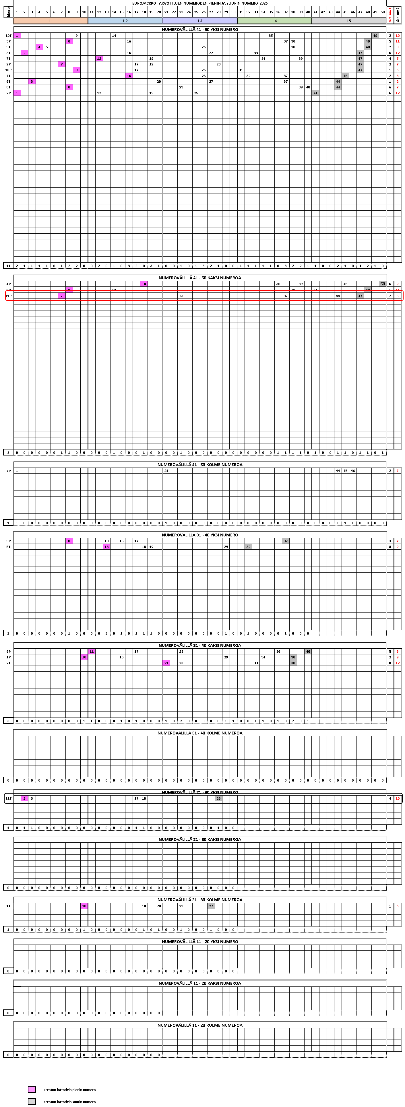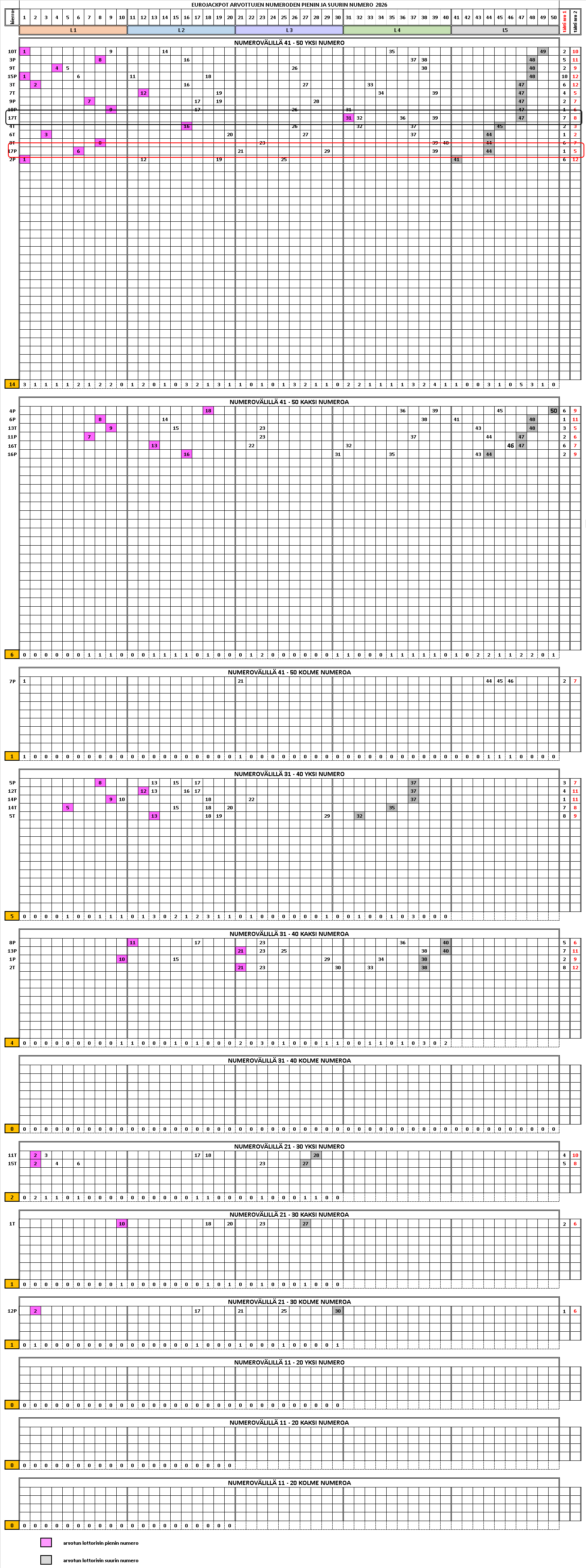 Taulukko kertoo milloin arvotut pienin – suurin numero ovat esiintyneet. Tämä antaa viiteitä siihen, kuinka haastavaa näiden kahden osumatuloksen kannalta tärkeän numeron valinta on.