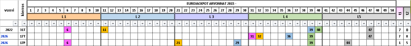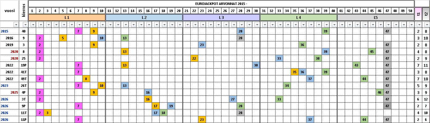 Taulukossa on vuoden 2026 arvotut eurojackpotrivit. Taulukko kertoo kaikki nämä viisi perustotuutta suoritetuista eurojackpot arvonnoista