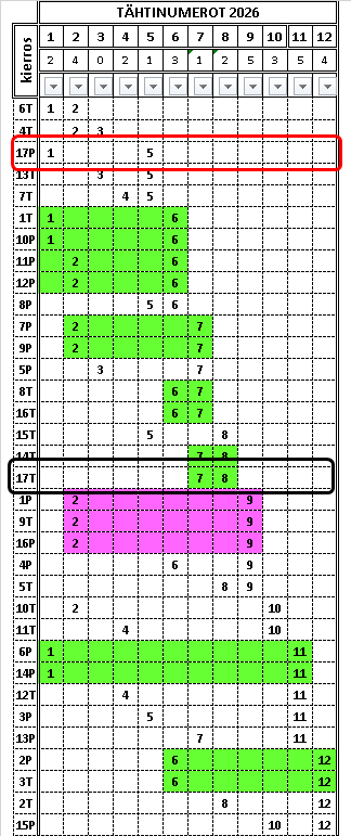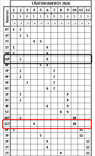 Taulukossa ovat arvotut tähtinumerot