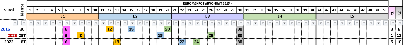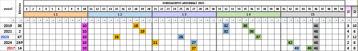 Ensimmäisen esimerkin arvotuissa numeroissa pienin arvottu numero on 10 ja suurin 46. Numerovälillä 41 – 46 riveissä on arvottuja numeroita välillä 1 - 3. Numerovälille 41 – 46 arvottujen numeroiden määrä ratkaisee, missä eurorivijärjestelmän määrässä 5 oikein osumatulos on ja eurorivit voidaan lajitella eurorivien rakennetaulukosta.