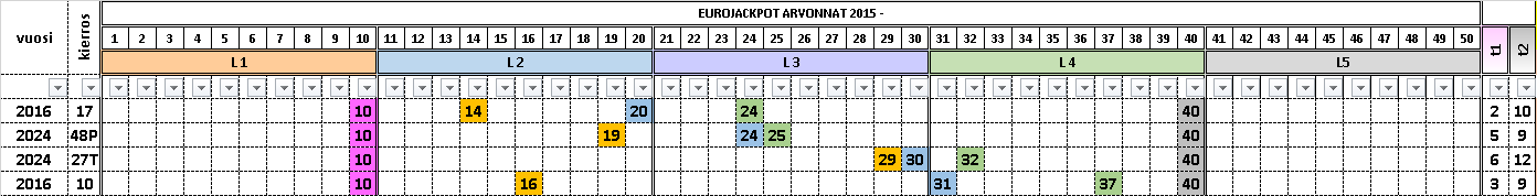 Toisen esimerkin arvotuissa numeroissa pienin arvottu numero on 10 ja suurin 40. Numerovälillä 31 – 40 riveissä on arvottuja numeroita välillä 1 - 3. Numerovälille 31 – 40 arvottujen numeroiden määrä ratkaisee, missä eurorivijärjestelmän määrässä 5 oikein osumatulos on ja eurorivit voidaan lajitella eurorivien rakennetaulukosta.