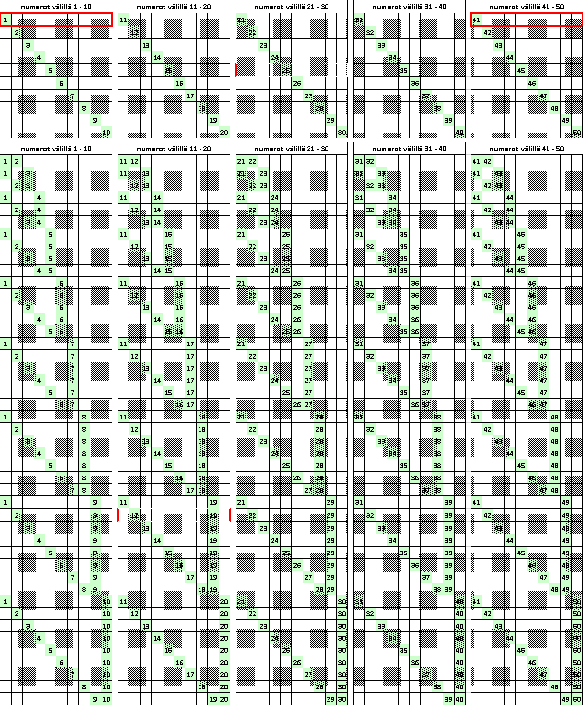 Taulukkoon on tummanpunaisella neliöity kohdat josta numerot valikoituvat.