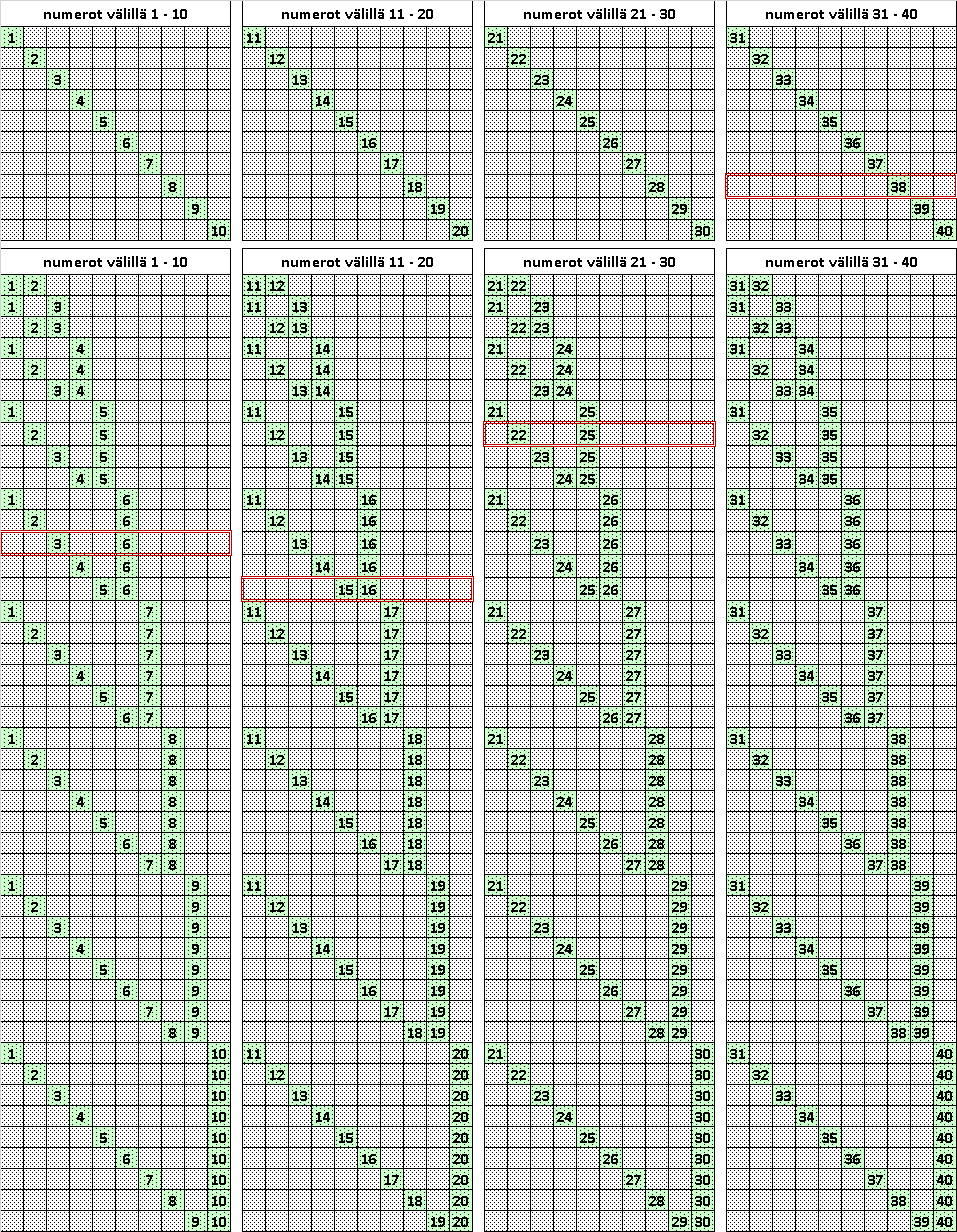 Yksinkertaistetaan numerojana 1 – 40, purkamalla, rajaamalla ja pelkistämällä se neljään osaan. Numerot välillä 1 – 10, numerot välillä 11 – 20, numerot välillä 21 – 30 ja numerot välillä 31 – 40. Näin voidaan laatia taulukkosarja, jossa jokaisessa yksittäisessä osassa olevien kombinaatioiden numeroiden määrä on 0 – 7 numeroa.