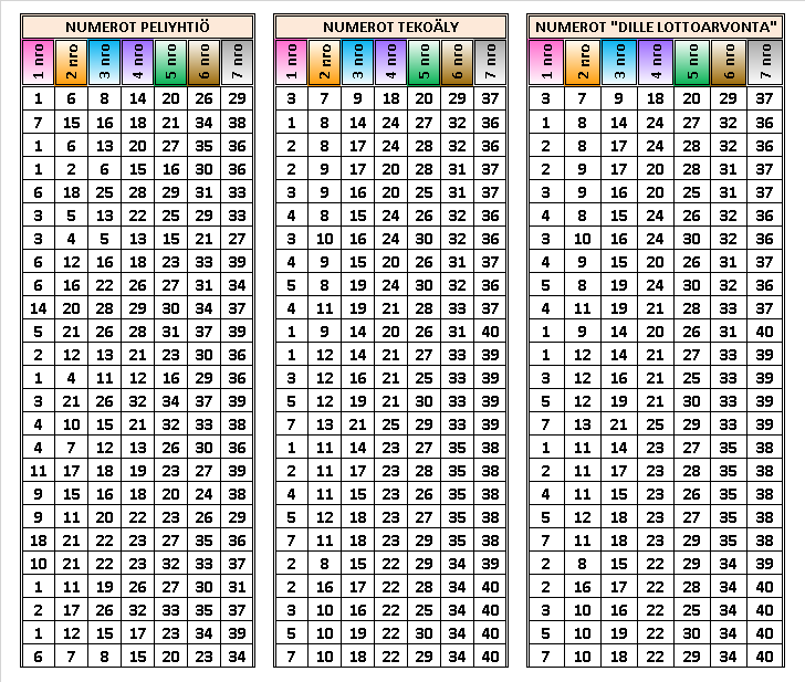 Taulukoissa rivit on lajiteltu eri taulukoihin. Ensimmäisessä taulukossa on arvotut rivit, joissa pelaajat ovat onnistuneet 7 oikein osumatulokseen.