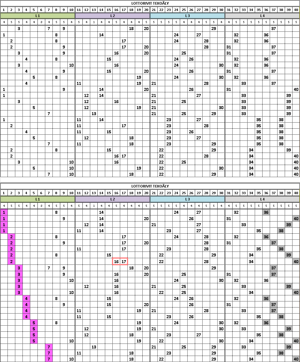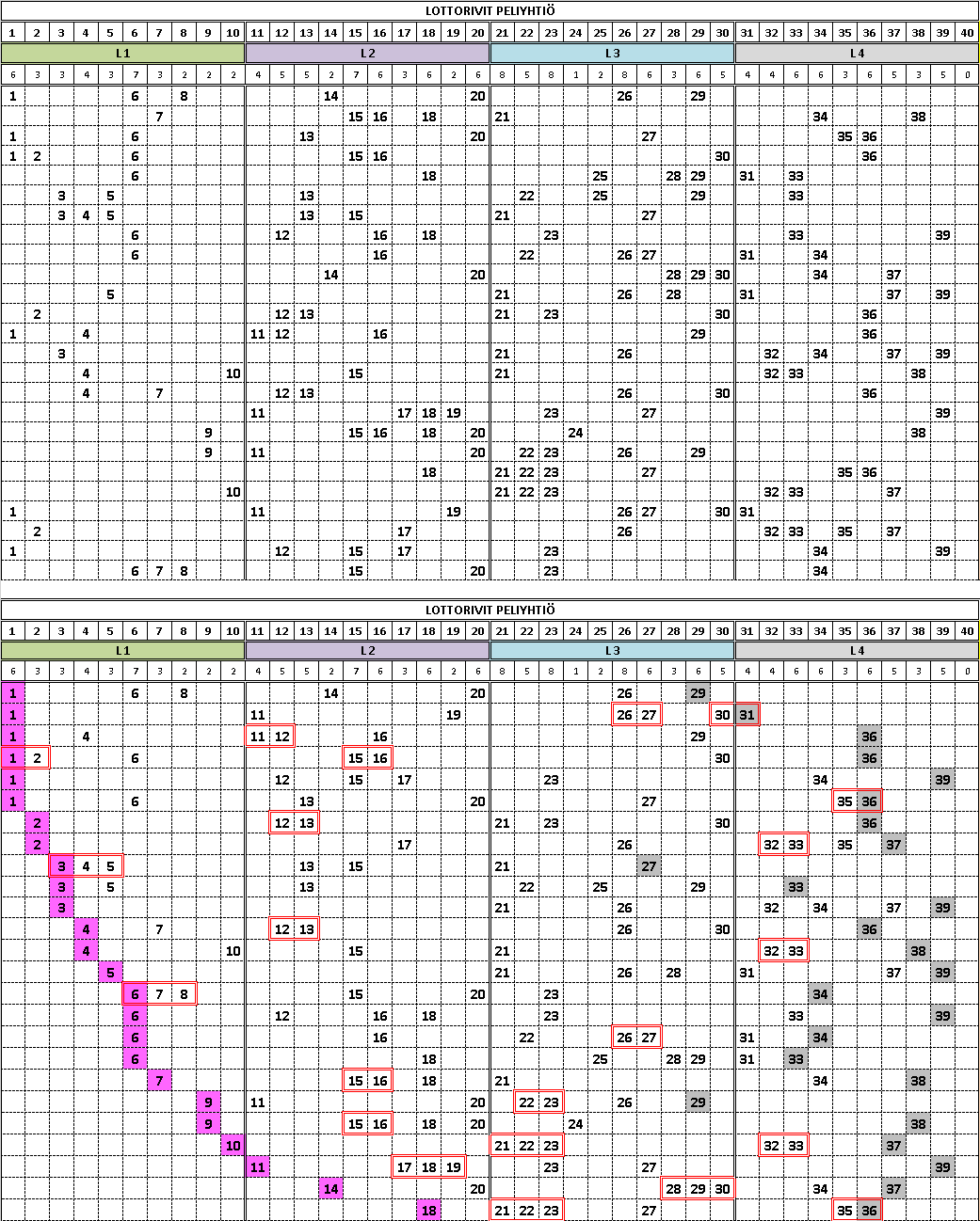 Ainoa vaihtoehto on, että hajautetaan yksittäiset lottorivit numerojanalle 1 – 40 ja tarkastellaan rivejä uudelleen. Taulukot ovat kaksiosaisia siten, että ylemmässä osassa seitsemän numeroa sisältävä rivi on perusmuodossaan ja alemassa osassa rivit ovat lajiteltu pienimmän numeron mukaiseen järjestykseen.