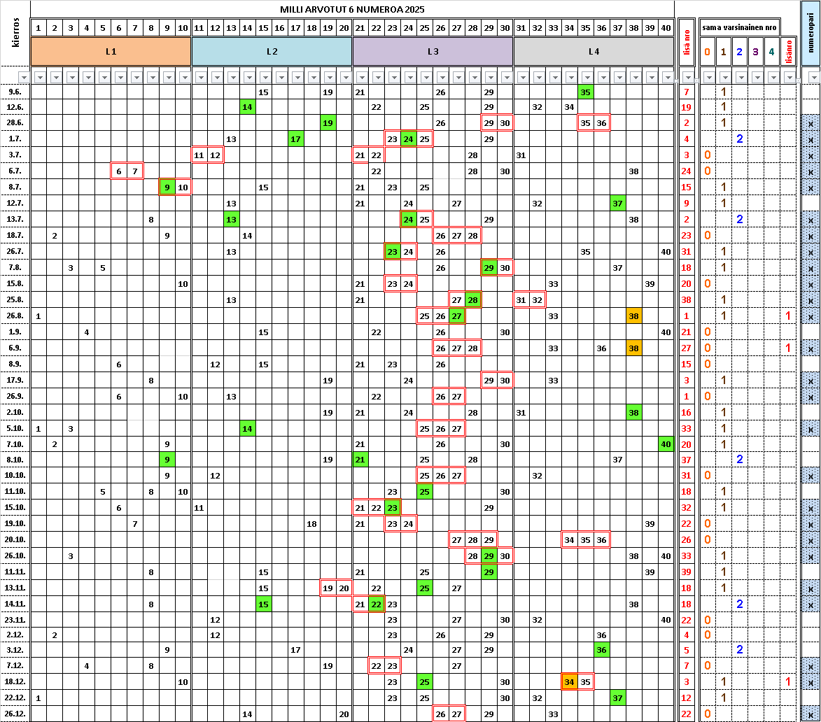 Nämä selviävät taulukoitaessa arvontoja. Taulukossa on vuoden 2025 - 2026 arvotuttuja riviä. Taulukko kertoo kaikki nämä viisi perustotuutta suoritetuista MILLI arvonnoista.