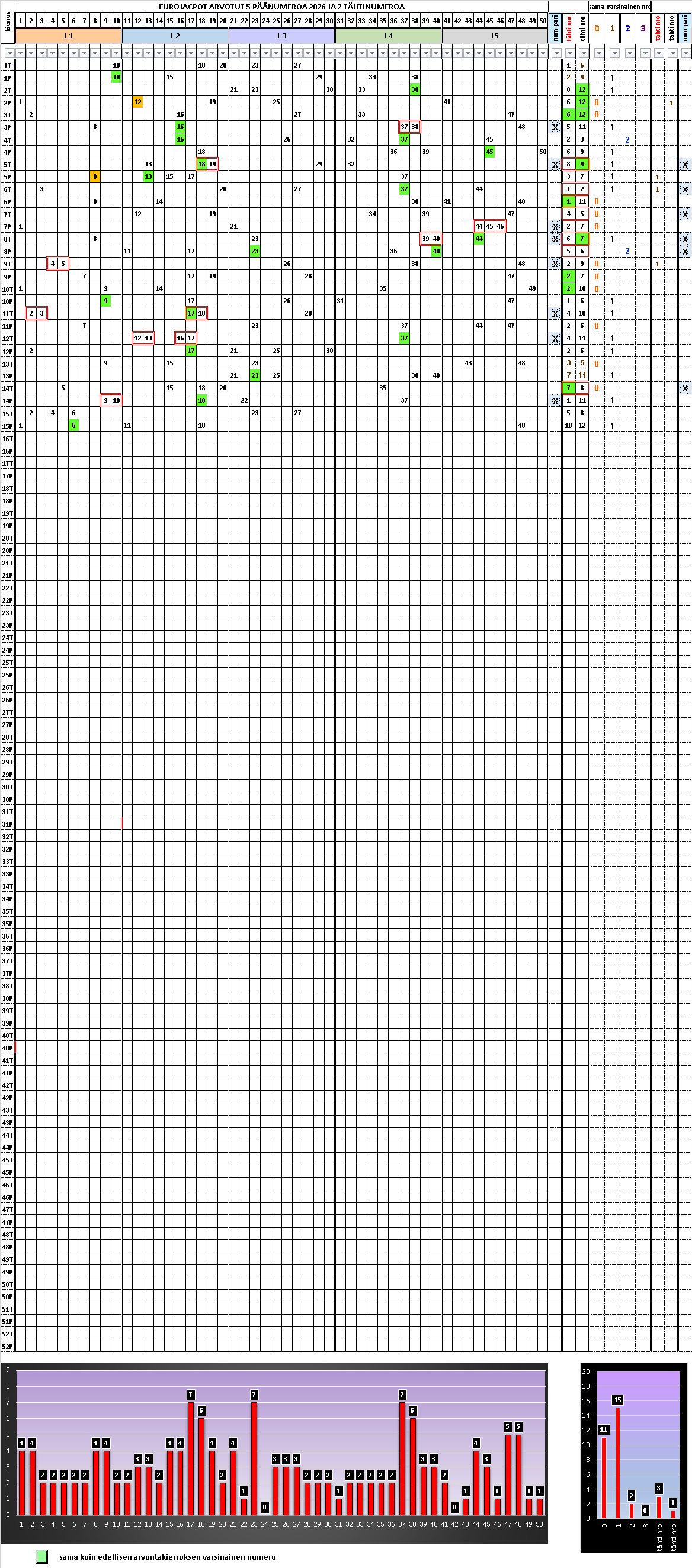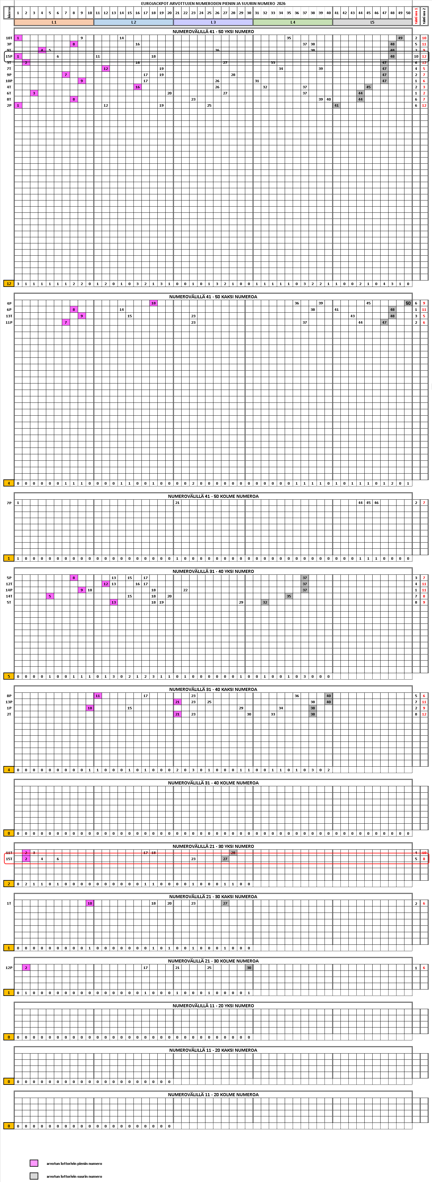 Taulukkoon on lajiteltu arvontatuloksia 2015 eteenpäin. Taulukko on laadittu EXCEL taulukkolaskentaohjelmalla ja siihen on lisätty suodata toiminto. Tällä toiminnolla on hakea taulukosta kaikkia näitä osumatulosmahdollisuuksia. Jos pelaaja aikoo tavoitella eurojackpot pelissä voittoon oikeuttavia osumatuloksia, taulukko on erittäin hyödyllinen. Tarkasteltaessa arvottuja päänumerorivejä tähtinumeroparin suhteen, taulukko kertoo, kuinka yksittäiset päänumerorivit jakautuvat pienimmän – suurimman numeron osalta. Tällekin ilmiölle on looginen selityksensä. Oikeastaan taulukko kertoo, miksi pelaaja häviää ja tulee häviämään pelaamansa rahat.