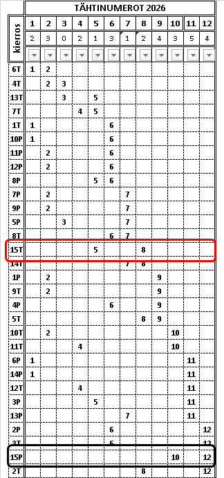 Taulukossa ovat arvotut tähtinumerot