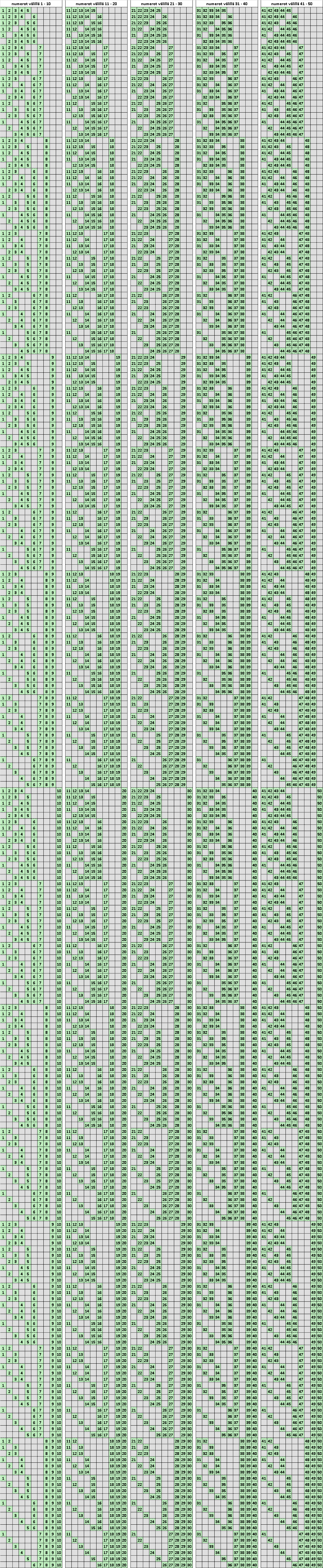 Matematiikassa on käytössä kymmennumerojärjestelmä numerot 0, 1, 2, 3, 4, 5, 6, 7, 8, 9 ja näistä muodostettavat kerrannaiset. Yksinkertaistetaan numerojana 1 – 50, purkamalla, rajaamalla ja pelkistämällä se viiteen osaan. Numerot välillä 1 – 10, numerot välillä 11 – 20, numerot välillä 21 – 30 numerot välillä 31 – 40 ja numerot välillä 41 – 50. Näin voidaan laatia taulukkosarja, jossa jokaisessa yksittäisessä osassa olevien numeroiden määrä on 0 – 5 numeroon.