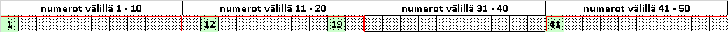 Taulukkoon on tummanpunaisella neliöity kohdat josta numerot valikoituvat.
